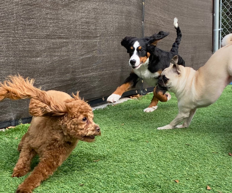 Group of dogs playing in a pool outdoors